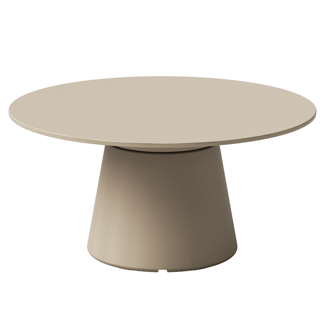 Mesa versátil con base central redonda y tapa redonda o cuadrada. La original base central de polietileno, está disponible en una amplia variedad de acabados estándar y también personalizados. La base se puede combinar con tapas de diferentes tamaños y materiales. La gran variedad de acabados y materiales disponibles permite componer la mesa requerida en cualquier contexto y espacio.
