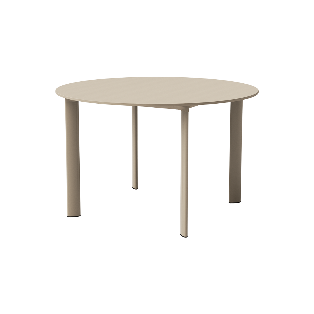 En la imagen: mesa con encimera redonda. El marco estructural y las patas están fabricadas con aluminio extruido. Disponible en tres alturas, 75, 90, y 105cm.
