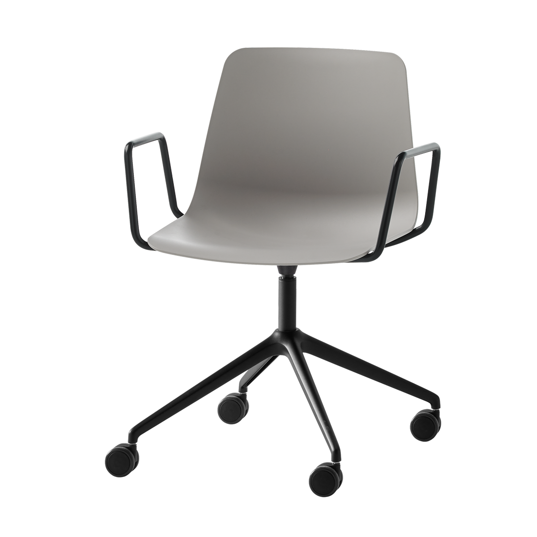 En la imagen: sillón giratorio con asiento de polipropileno y base giratoria de 4 radios de aluminio equipada con ruedas de rodadura blanda de Ø65mm. La altura del asiento no es ajustable.