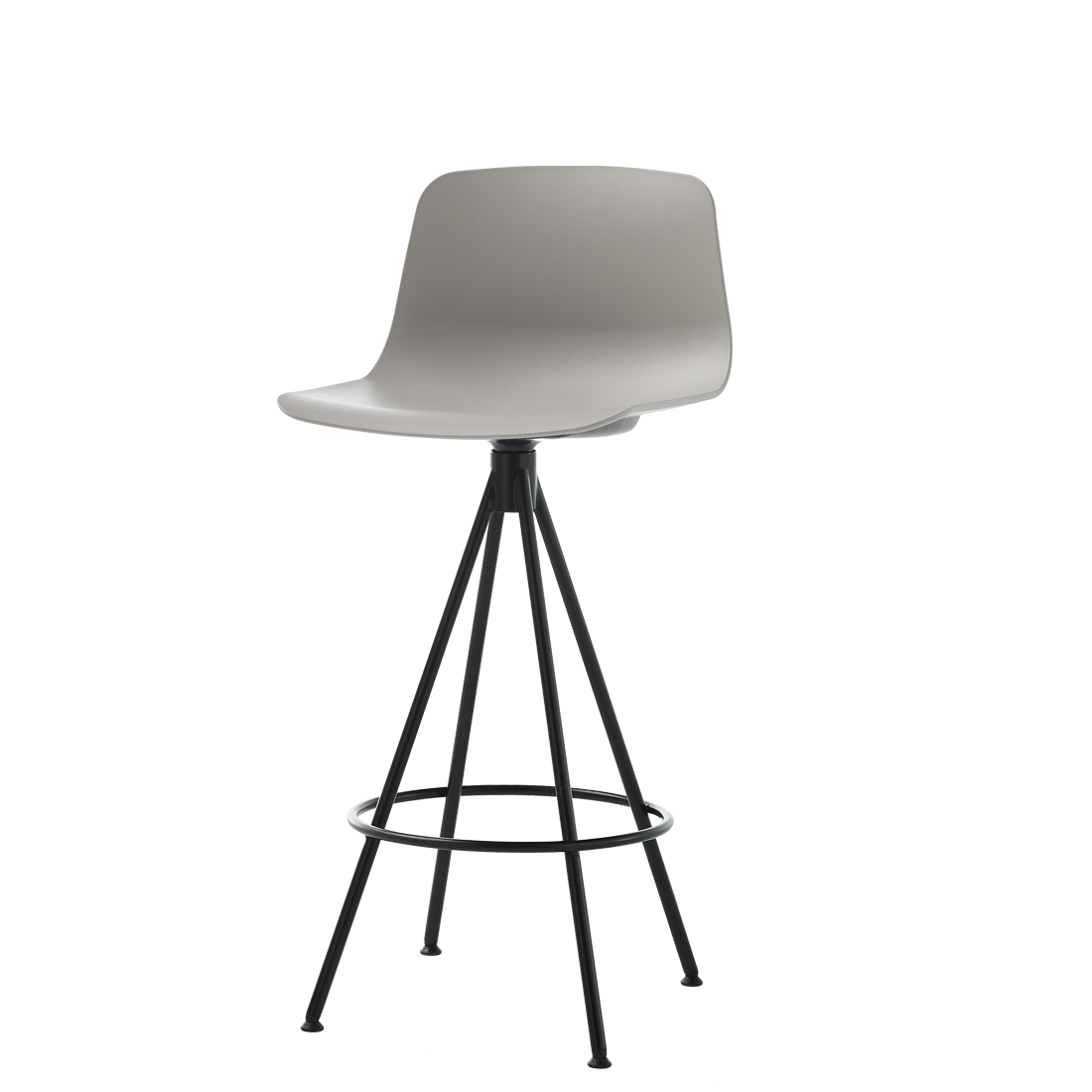 En la imagen: taburete medio con asiento de polipropileno y base giratoria de 4 radios de acero.