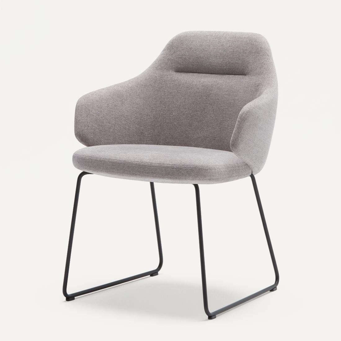Upholstered armchair with medium backrest and round steel rod sled frame.